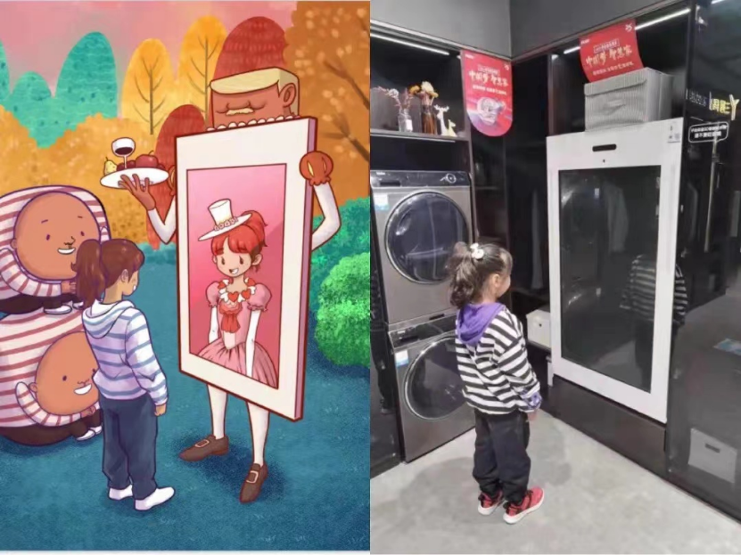 12月3日,程鹏在其个人微博上发布了几幅新作。一如往常,这次也是他以女儿照片为原型的“魔改”漫画。在他笔下,女儿在三翼鸟青岛体验中心001前的画面变成了举着火炬的“雅典娜”,站在懂衣智能云镜前的体验画面也成了正在梦游仙境的“小爱丽丝”……