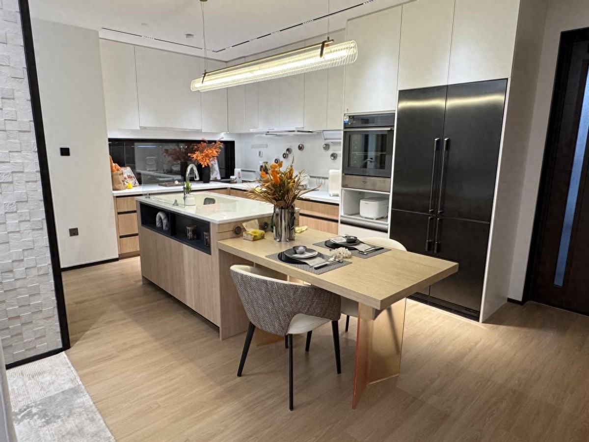 与中国建科共创的“柔性空间好房子”,重在空间的高适配性。该样板间采用柔性可变设计理念与全屋智能相结合,针对不同家庭阶段不同需求,提出柔性空间的高适配性解决方案。可灵活应对二人世界、三口之家到老年生活的过渡,以及聚会、生活、休闲等多种场景的切换,让“一宅一生”的梦想照进现实。智慧餐厨里一句话就能开启沉浸式浪漫就餐氛围;智慧卫浴采用四分离+电动移门设计可供多人同时使用,配备的SOS按钮还能在老人沐浴跌倒时提供安全呼救;书房开启阅读模式后,暖黄的阅读灯亮起,营造专注阅读的场景氛围。