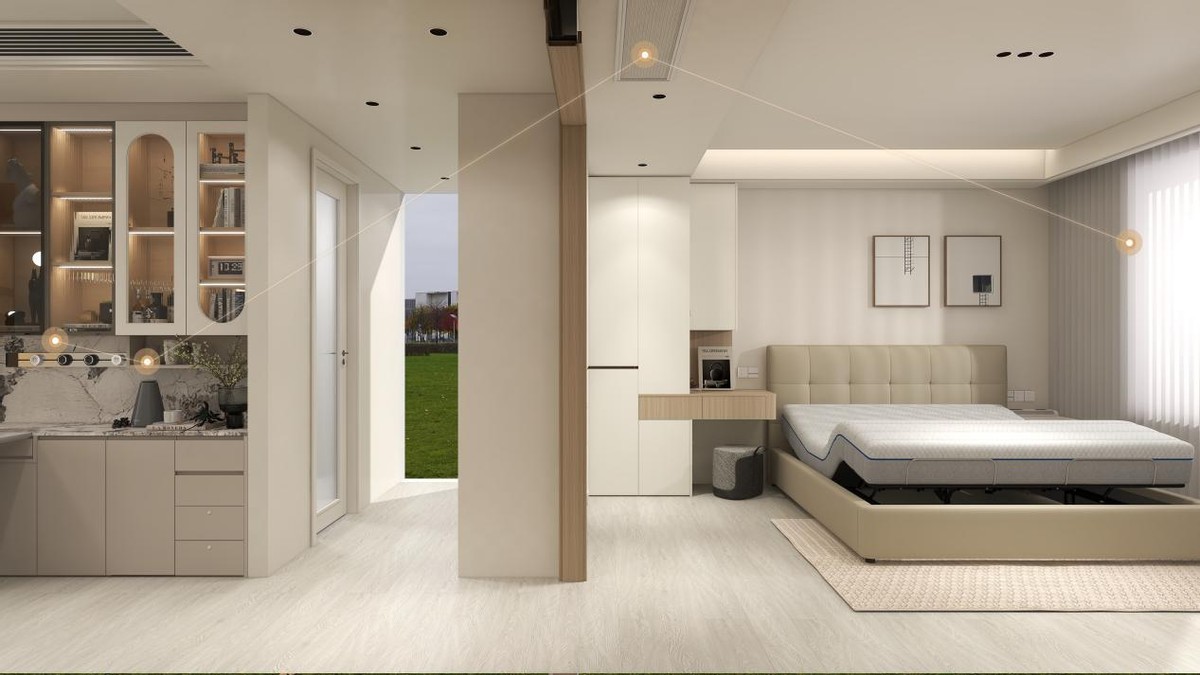而在保障老人安全方面,这套样板间更做得到位。不用担心老人日常用火用气安全,厨房声光报警器、燃气感应器和烟雾感应器共同形成安全保护盾,实时监测,防患于未然。更贴心的是智慧卧室场景体验,多模智能床能根据老人需求抬高或降低,其内置的传感系统还能监测心率、呼吸等生命体征,一旦有异常,及时预警,儿女可通过手机APP第一时间收到提醒,抓住黄金救护时间,不能常伴老人身边的儿女不用过度忧心。