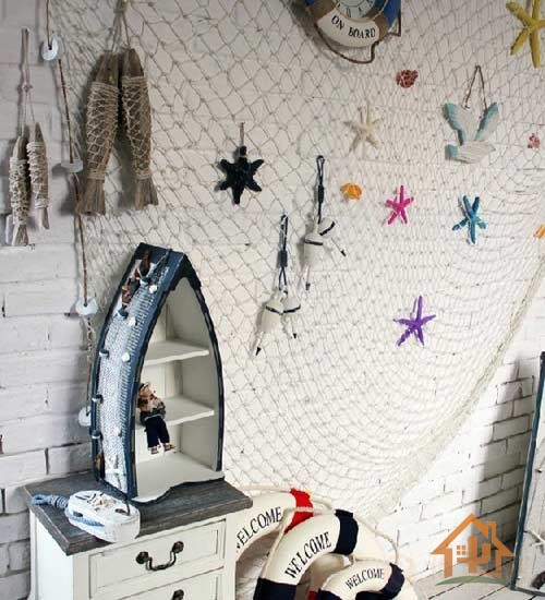 技巧要点:空空的墙壁,用一些小装饰品来装饰吧,让他们给我们的墙壁带来不一样的地中海风情。白色的渔网挂在墙壁上,网上挂上各种色彩的海星、 贝壳,海螺壳,木鱼,可爱的造型,亮丽的色彩,一网丰盛的物品,令正面墙壁变得更具地中海风情。船头样式的一个收纳架,里面分层的样式可以摆放上一下小物 品,外面蓝白相间的色彩,更具出海后的一抹沧桑与丰收之情。再搭配大小不一的救生圈,更装饰出地中海风情特有的品味。