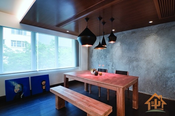 以人工批荡而成的灰色主题墙与原木餐桌相眏成趣,配以数盏淡黄灯光的吊灯,散发着几许暖意。