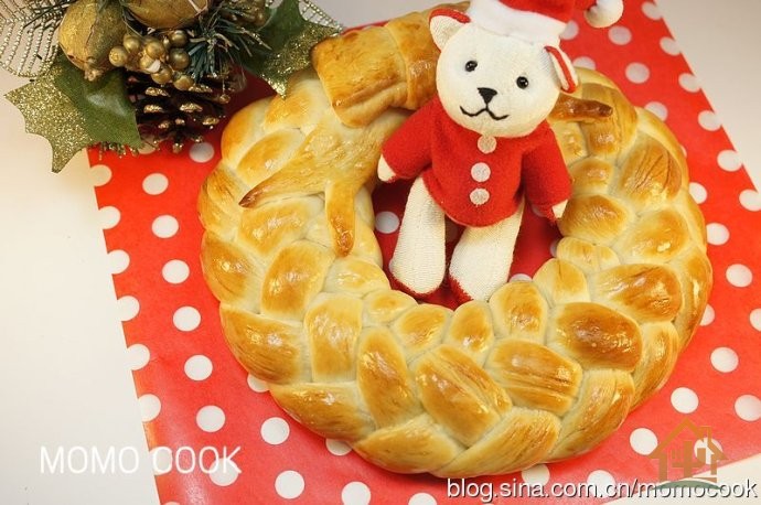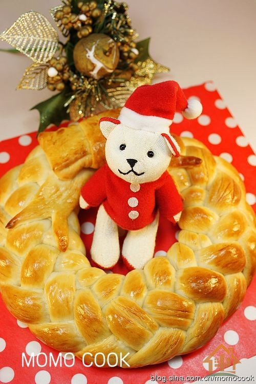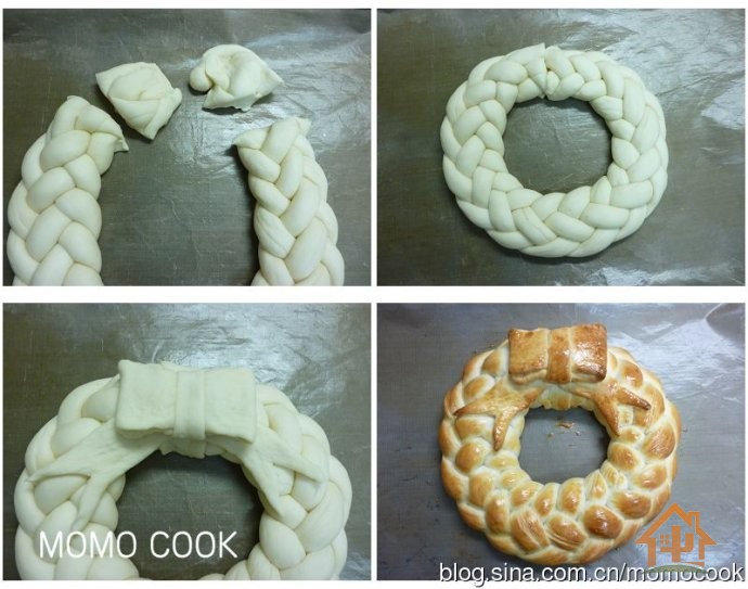 一个漂亮的带着蝴蝶结的圣诞节花环面包就完成啦!