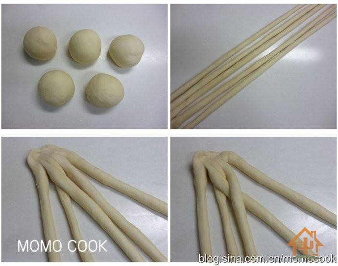 3 如图将五条面包坯一端紧捏一起.中间第二,第三根交叉,第二根在第三根上面.