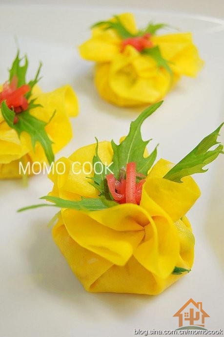 12 然后,装饰上青菜叶,红姜丝。小朋友不吃姜丝的,您可以用火腿或者三文鱼肉来代替。