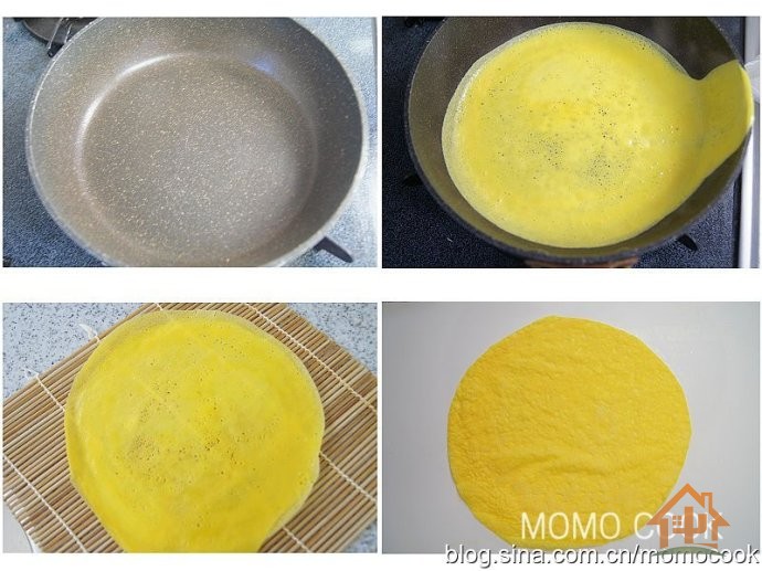 6 倒入少许蛋液,铺满整个锅底。注意不要太厚,且要均匀哦。
