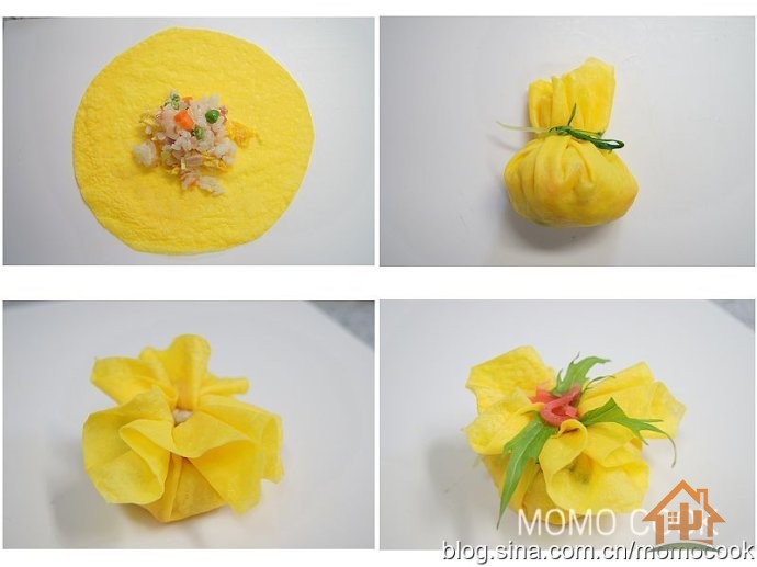 9 将晾凉的薄蛋烧用刀切去边缘部分。放入适量蛋炒饭。