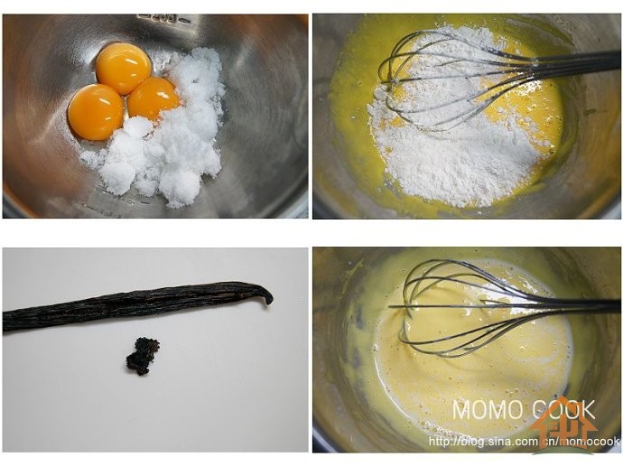3 将香草荚划开,取出里面的香草颗粒混合在蛋黄液里。如果没有香草荚,用香草精代替也可以。
