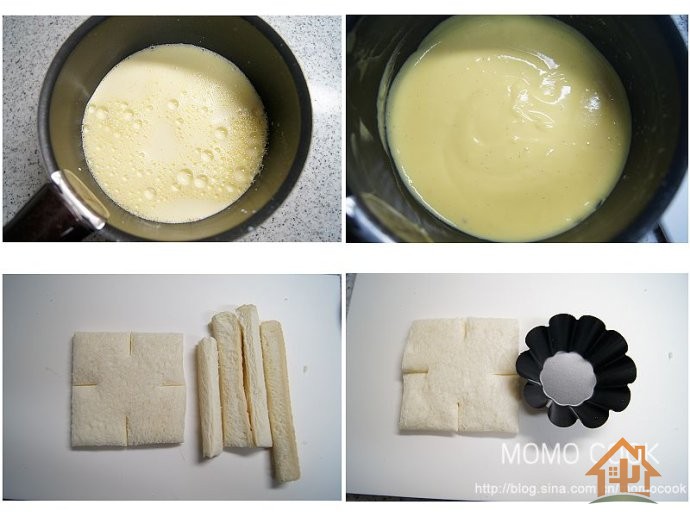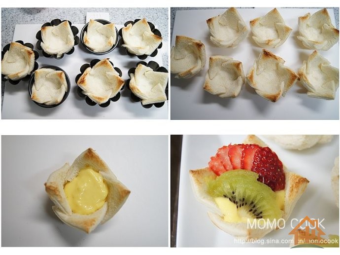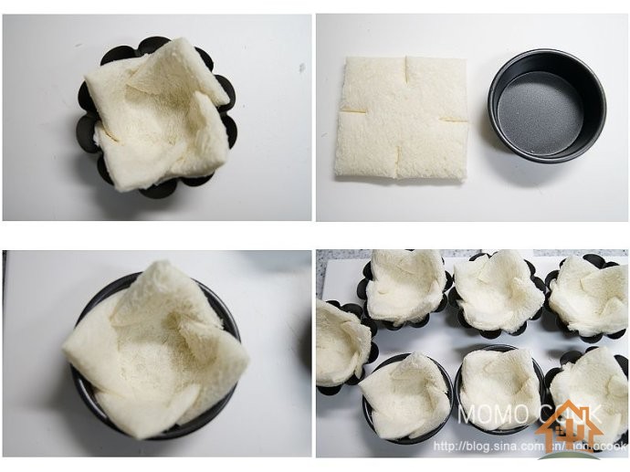 9 将面包片如图一样放入容器中,做成花杯形状,注意接口处稍用力按紧,防止烤后松散。