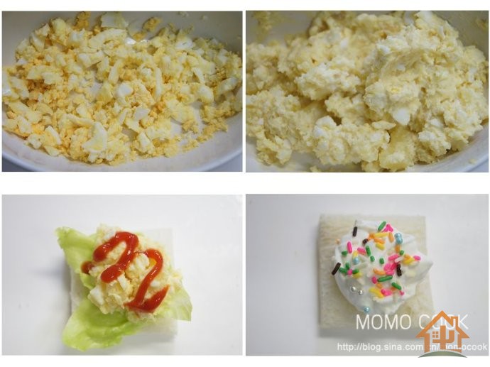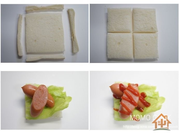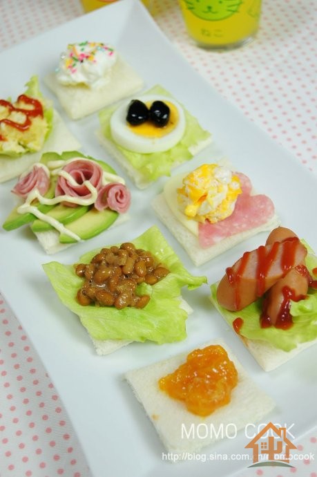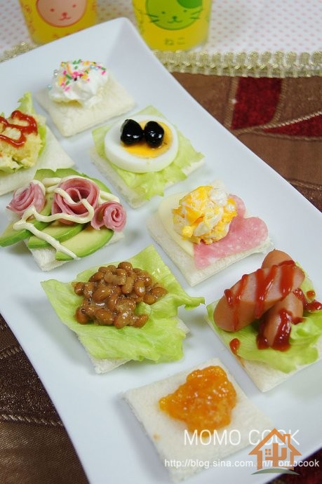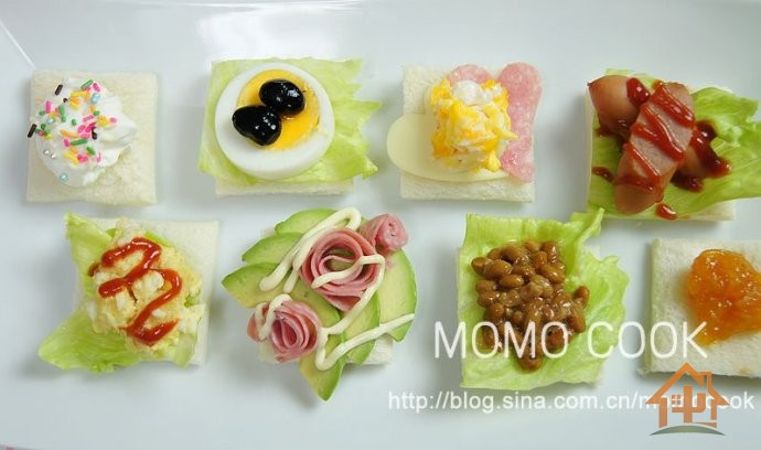 材料(8小块):吐司面包2片 小香肠,火腿,鸡蛋,芝士,鄂梨,生菜等等您自由变化 调味料主要是色拉酱,番茄酱