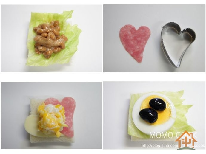 7 取一片芝士,同样切成心型。两个心型重叠放在面包上,最上面放一些煎鸡蛋。第三块也做好了。