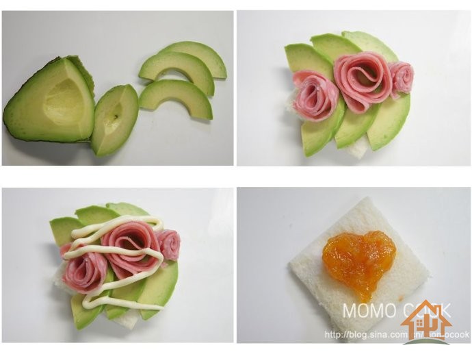 10 将鄂梨放在面包上。上面用火腿片卷几朵小玫瑰,注意这里的火腿片是刚刚切心型的时候剩下的,用在这里非常合适哦。