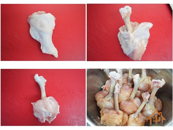 3 将离骨的肉翻过来,一直翻到最下面,使翅根成小锤形状。