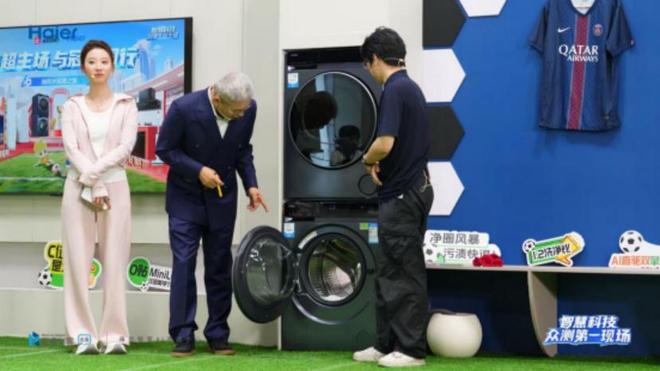 其一,体育 IP 跨界赋能,精准渗透核心人群。今年9月,海尔官宣成为巴黎圣日耳曼与利物浦两大顶级足球俱乐部全球官方合作伙伴,精准触达家电消费中坚力量——体育迷群体。在双11期间,海尔邀请央视体育解说员刘建宏化身“海尔AI科技体验官” 坐镇超级品牌日直播间,激情开麦、经典再现。直播中,足球大咖们高手过招,“海超战队”一起致敬经典,让粉丝们倍感惊喜。