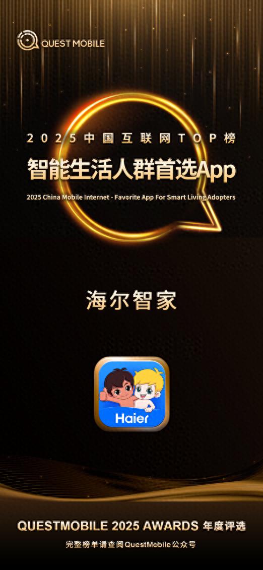 1月27日,QuestMobile发布《2025中国互联网价值榜》,海尔智家App荣获2025智能生活人群首选App。作为国内权威移动互联网大数据研究机构,QuestMobile榜单数据源自真实市场调研分析,客观反映了各品牌App在行业的活跃渗透水平。此次获奖,不仅印证海尔智家App的用户规模优势,也体现其在智慧家庭领域的行业领先地位。