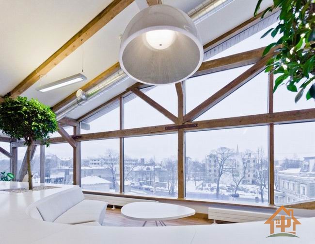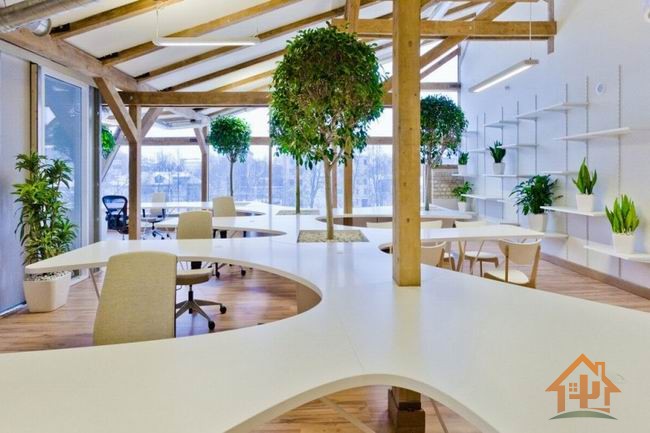 精心打造的。一个现代化的开放式办公空间,室内摆满了绿色的植物。
