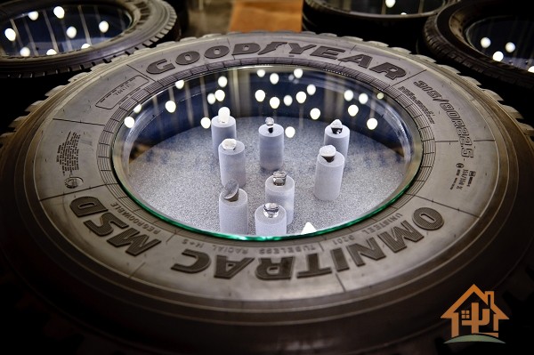 店内天花板悬挂着三盏树状大吊灯,它们由大型卡车轮胎、工程照明灯和大块水晶组合而成,令人印象深刻。大量轮胎分组摆放在店内水磨石地板上,被设计师以LED灯来装饰展示珠宝,与亮晶晶的石板灰色背景形成鲜明对照。配饰和皮革制品摆放在轮胎展示台上,在毛玻璃表面的映衬下闪闪发光。挂衣杆和改造过的自行车支架镶嵌在墙壁上,同时对面墙壁也镶嵌有数个用半截轮胎且玻璃加盖制成的展示台,用于产品展示。
