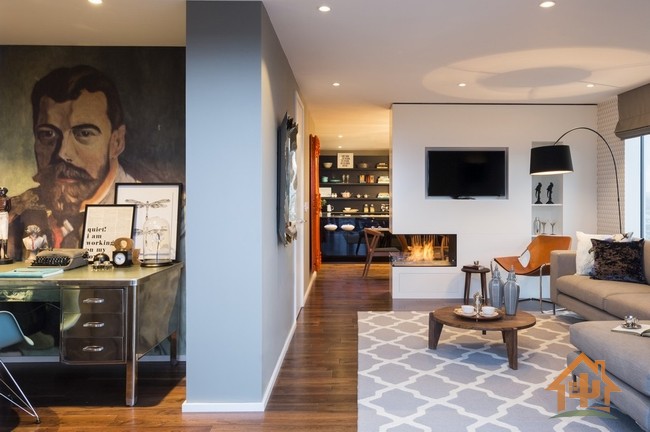 苏娜室内设计最近为斐乐门茨一家完成了他们位于伦敦核心区一套三居室复式公寓的设计。该项目简单要求是要包括原创艺术作品。为此客厅配有真皮Paulistano椅子,珍妮弗科利尔创作的艺术品地图和Jayoon choi的画作之一。折衷的组合,暖色铜加上迷人的斯堪的纳维亚壁纸。通过定制沙发上哈克尼之家天鹅绒般的坐垫,对面墙上的华丽镜子上充满活力的橙色,以及定制的温暖了客厅和餐厅的双面壁炉,房屋的温馨得以表达。室内设计师丽贝卡·塔克介绍:“这对于苏娜室内设计来说是一个理想的项目。我们注重规范,用阳刚与光泽的黑色厨柜,胡桃木地板和后挡板,优雅的厨房大理石的丰富色调表达室内设计。最终,我们通过添加皮革和铜色调把这个设计提高到一个新的水平。”这间宽敞的公寓使用铜色和阴郁灰色,并加入海军蓝以及绿色作为配色。