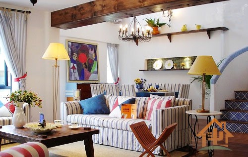 设计说明:地中海风格集中了西班牙蔚蓝色的海岸与白色沙滩,希腊的白色村庄在碧海蓝天下简直是制造梦幻,南意大利的向日葵花田流淌在阳光下的金黄、法国南部薰衣草飘来的蓝紫色香气、北非特有沙漠及岩石等自然景观的红褐、土黄的浓厚色彩组合。地中海的色彩确实太丰富了,并且由于光照足,所有颜色的饱和度也很高,体现出色彩最绚烂的一面。地中海的颜色特点就是,无须造作,本色呈现。在业之峰装饰装修设计上,线条是构造形态的基础,因而在家居中是很重要的设计元素。地中海沿岸对于房屋或家具的线条不是直来直去的,显得比较自然,因而无论是家具还是建筑,都形成一种独特的浑圆造型。