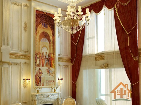 追求华丽,高雅的古典,以华丽的装饰,浓烈的色彩,精美的造型达到雍容华贵的装饰效果。大型的灯池,华丽的吊灯,点缀的浮雕来营造气氛。墙面采用高档壁纸,以及优质乳胶漆,已烘托豪华效果。
