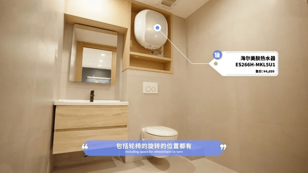 比如在会客厅里,廖智通过全屋语音控制系统,就能轻松操控空调、冰箱、扫地机的使用;轻厨房区放置了嵌入式蒸烤一体机,无需处理食材,通过冰箱大屏下单预制菜品,选择烤箱菜谱,一键即可烹饪;卫生间的内置空间方便轮椅进入,连轮椅的旋转位置都有……可以说,每个场景里不需要太多人为操作,场景的感知与决策创造了一系列主动服务,而廖智要做的,则仅仅是享受生活。